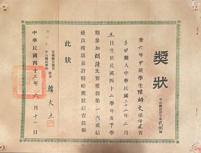 1954甲午馬年,自是年6月11日,陸炳文榮蒙中山國校韓火土校長頒發朗讀比賽第一名獎狀起,繼1962年9月28日,再蒙中國孔孟學會陳大齊理事長核頒第一屆全國孔孟學說論文競賽大專組第一名獎品,至1964年9月18日,又獲陸軍總司令劉安祺上將,頒下大專學生暑期集訓班期末論文寫作比賽第一名獎狀,12年一紀之間,為文申論主軸,始終環繞著中華道統:堯、舜、禹、湯、文、武、周公、孔子、而孫文,開創了「天下為公」的大同境界,是儒家思想中理想的聖王典範,奠定了中華文化道德與和諧仁政的基礎。